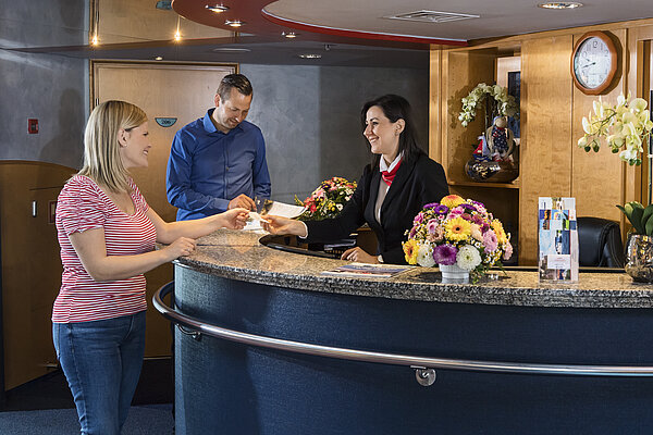 Die Rezeption befindet sich direkt beim Eingangsbereich am Ende des Atriums. Sie ist die Anlaufstelle während Ihres Aufenthaltes, um alle wichtigen Informationen zu Ausflugszeiten, Reiseinformationen etc. zu erhalten. Direkt davor wurde im Boden ein einzigartiger Glasboden mit Beleuchtung eingelassen, der einen Blick direkt in die Welt "unter Wasser" gewährt!