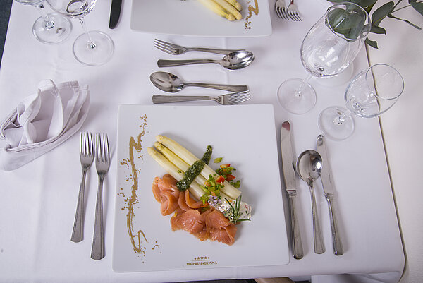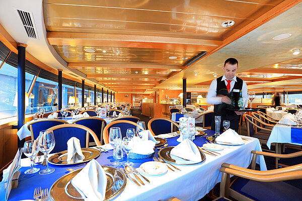 Die Spezialitäten der gepflegten Wiener Küche werden von der 41-Mann/Frau-Gastrobrigade frisch an Bord durchwegs unter Verwendung von Bio-Produkten zubereitet.