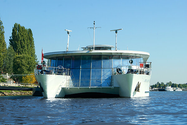 Sie wollten schon immer mal sehen wie der Katamaran mit 9 m Bugverglasung von Innen aussieht? Genießen Sie die virtuelle Reise durch das einzige Kreuzfahrtschiff mit österreichischer Flagge auf der Donau.