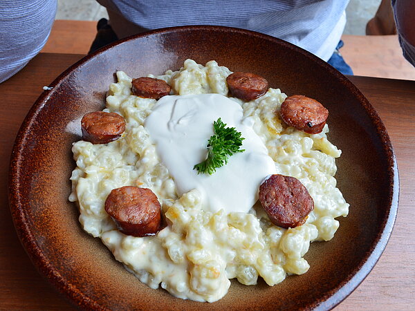 Die slowakische Küche ist geprägt von Fleisch, Kartoffeln, Milch und Sauerkraut. Ein echtes Nationalgericht der Slowakei ist Bryndzové halušky, auch bekannt als Brimsennockerl. Diese kleinen Klöße aus Kartoffelteig werden mit Schafsfrischkäse (bryndza) vermengt und anschließend mit knusprigem Speck garniert. Traditionell wird das Gericht mit saurer Milch oder Buttermilch serviert. Bryndzové halušky sollte auf einer Radreise von Wien nach Budapest auf keinen Fall fehlen.