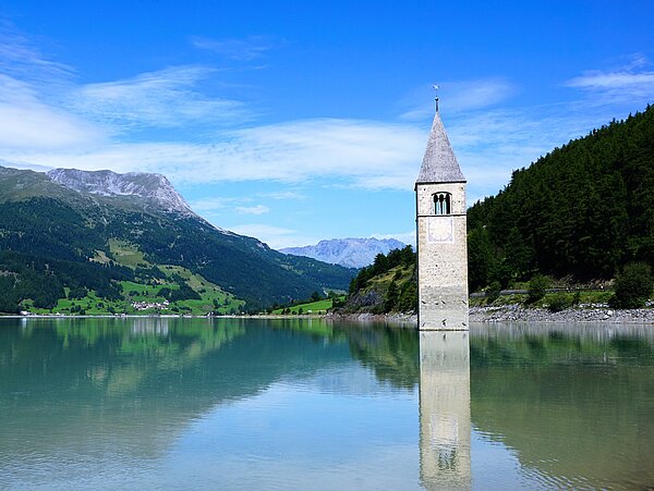 Märchenhaft und zugleich faszinierend erhebt sich der versunkene Kirchturm aus dem 6 km langen, kristallklaren Reschensee, eingerahmt von der beeindruckenden Bergkulisse des Langtauferer Tals. Der einsame Turm ist ein Relikt der Vergangenheit und heute ein unter Denkmalschutz stehendes Wahrzeichen des Vinschgau. Als beliebtes Fotomotiv und Anziehungspunkt für Besucher zieht der Turm im Reschensee Jahr für Jahr zahlreiche Neugierige und Naturbegeisterte in seinen Bann.